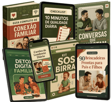 Você recebe 90 brincadeiras prontas, guia de conversas estruturadas e checklist diário para usar em apenas 10 minutos por dia tudo pronto, é só seguir e começar a criar memórias que seus filhos vão lembrar pra sempre..